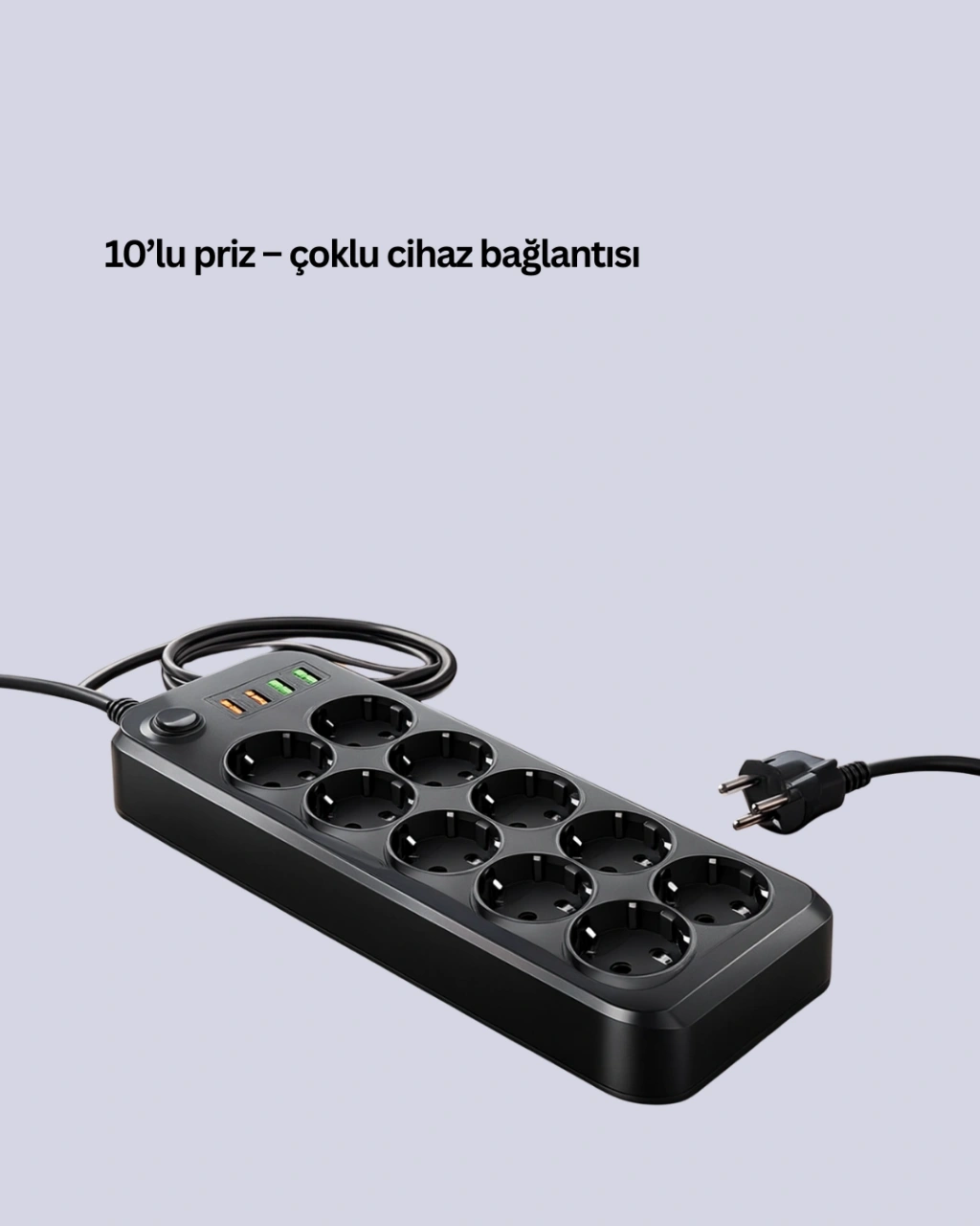 Termal Akım Korumalı 10’lu Grup Priz, yüksek güç gerektiren elektronik cihazlarınızı güvenli şekilde çalıştırmanız için tasarlanmış profesyonel bir enerji dağıtım çözümüdür. 2500W güç kapasitesi sayesinde bilgisayar, televizyon, küçük ev aletleri, ofis ekipmanları ve teknik cihazlarda yüksek performans sunar. 10 adet priz çıkışı, çoklu kullanım gerektiren ortamlarda kablo kalabalığını ortadan kaldırarak düzenli ve güvenli bir kullanım sağlar.En önemli özelliklerinden biri termal akım koruma teknolojisidir. Bu sistem, prizde oluşabilecek aşırı ısınmaları algılar ve devreyi otomatik olarak keserek güvenliğinizi üst seviyede tutar. Böylece voltaj dalgalanmaları, ani akım değişimleri veya aşırı yüklenme gibi riskler minimuma indirilir.Cihaz üzerinde yer alan USB ve Type-C 2.1A çıkışlar, telefon ve tablet gibi mobil cihazlarınızı ek adaptör kullanmadan hızlı bir şekilde şarj etmenize olanak tanır. Hızlı şarj desteği sayesinde iş ve günlük yaşam akışını kesmeden pratik kullanım sağlar. Hem ofiste hem evde çok yönlü bir çözüm sunar.2 metrelik kalın kablo yapısı, ürünün kullanım alanını genişletir. Çalışma masası, televizyon ünitesi, teknik odalar veya kişisel bilgisayar sistemlerinde esnek yerleşim olanağı sunar. Kullanım alanını dilediğiniz şekilde şekillendirebilir, güç kaynağına uzak noktaları bile rahatça kullanabilirsiniz.Hem estetik hem fonksiyonel tasarımıyla modern bir görünüm sunan bu çoklu priz, güvenli kullanım için geliştirilmiş bir alt yapıya sahiptir. 10A koruma ünitesi sayesinde voltaj değişimlerine karşı ekstra güvenlik sağlar.Yoğun cihaz kullanılan alanlarda düzen, güvenlik ve güç yönetiminin öncelik olduğu her ortam için ideal bir üründür.