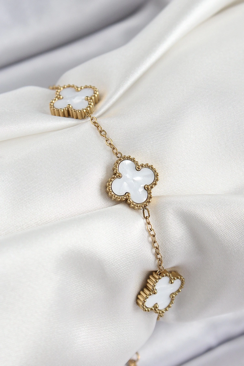 316L Çelik Beyaz Sedef Yonca Model Gold Renk Kadın Bileklik