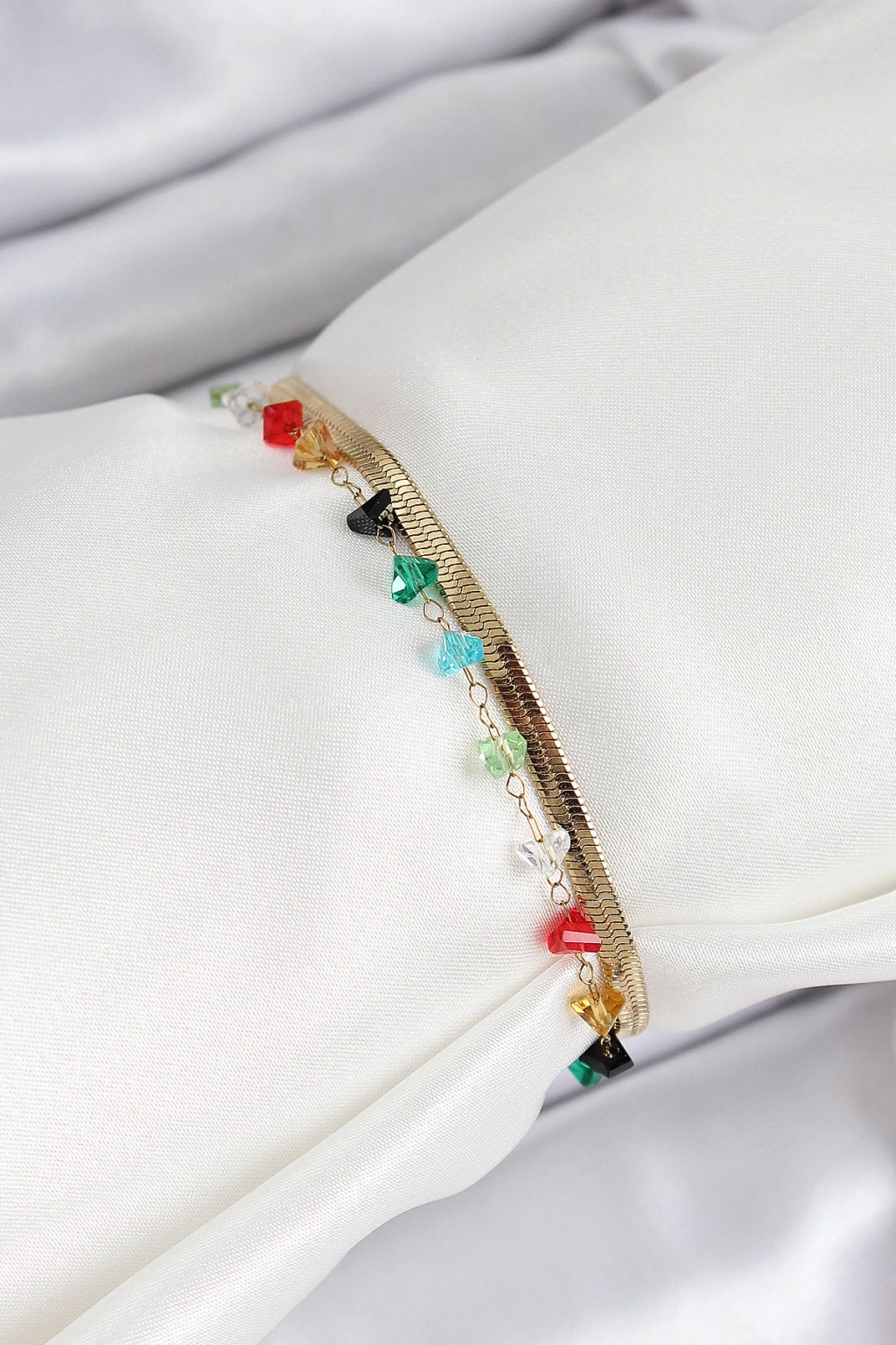 316L Çelik Gold Renk Kristal Karışık Renkli Taşlı 2'li Kadın Bileklik
