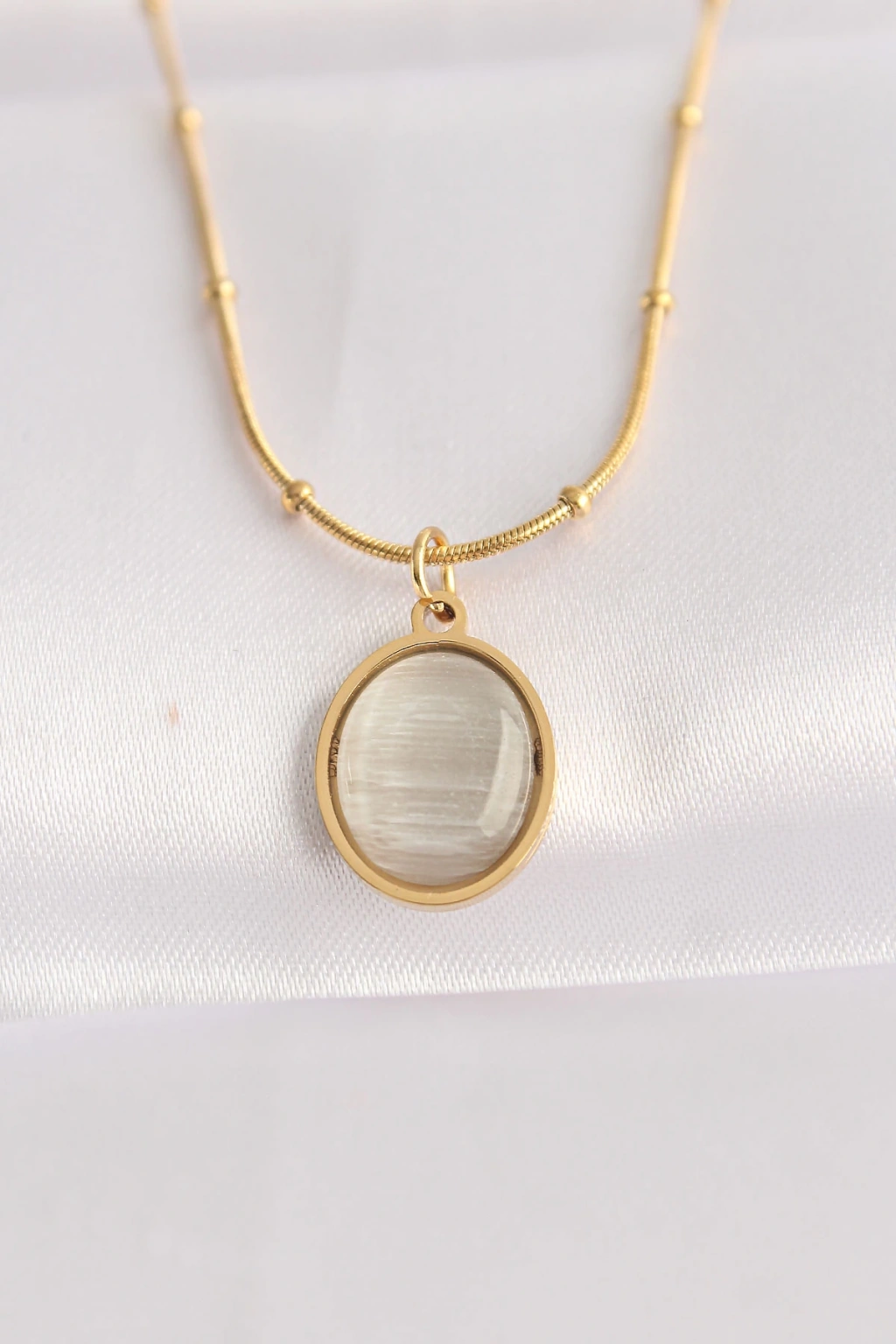 316L Çelik Zincir Altın Renk Gri Sedefli Oval Figürlü Kolye