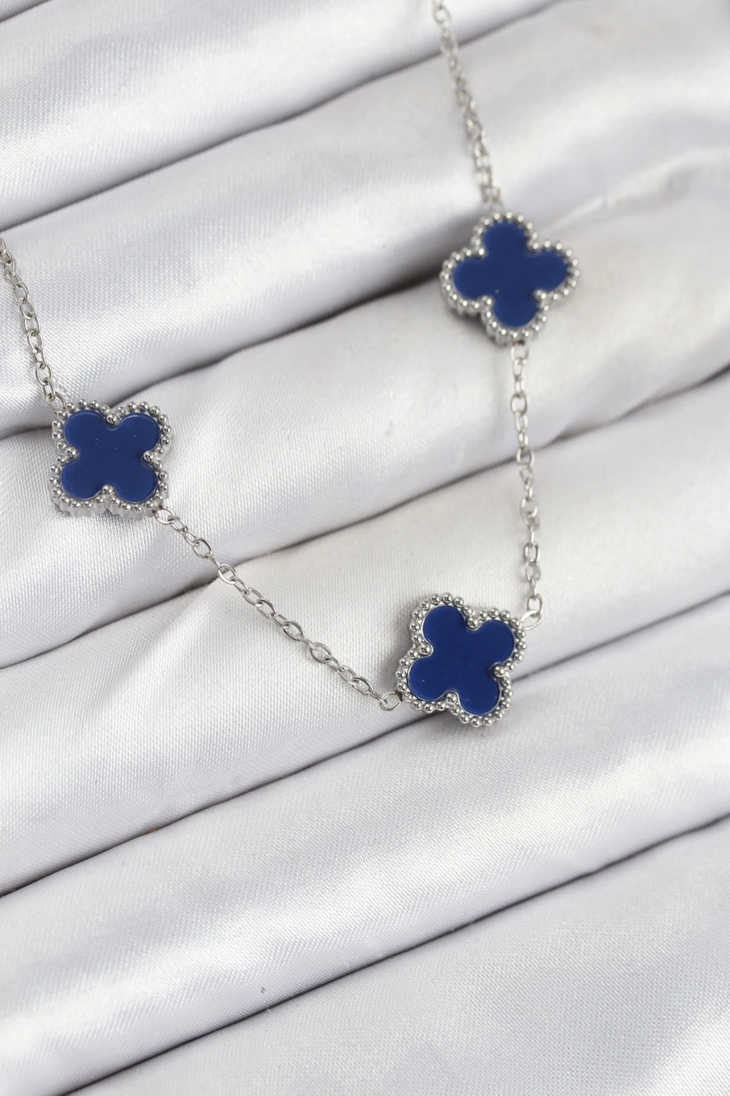 316L Çelik Zincir Gümüş Lacivert Renk Yonca Kadın Kolye