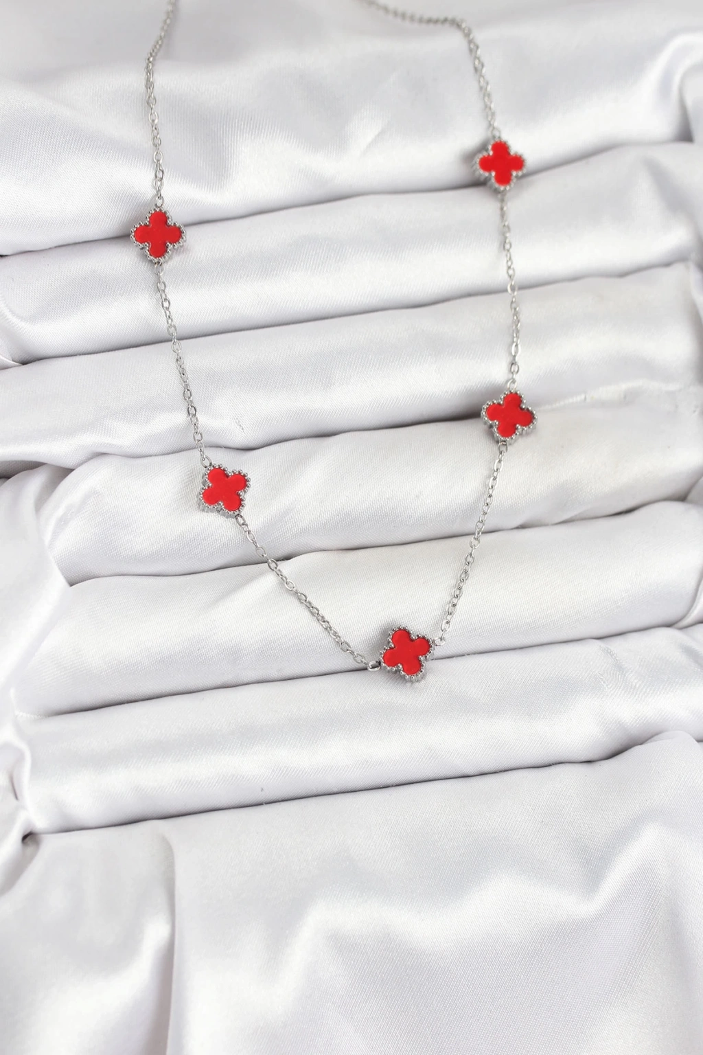 316L Çelik Zincir Gümüş Kırmızı Renk Yonca Kadın Kolye