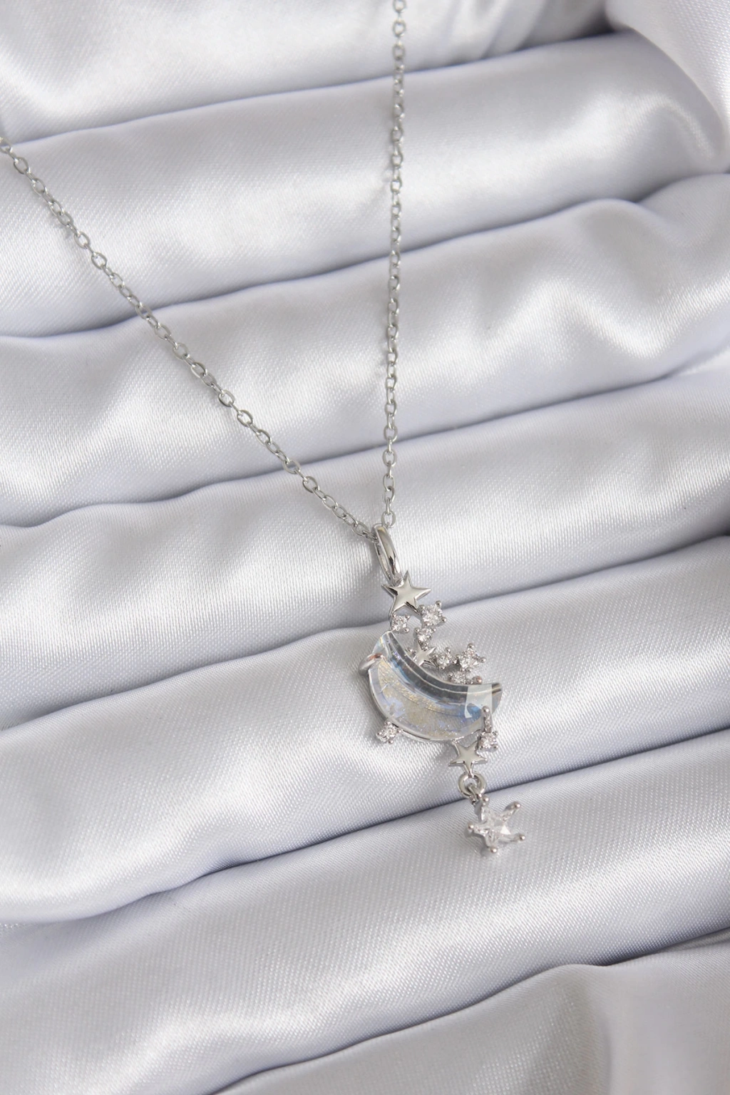 316L Çelik Zincir Gümüş Renk Zirkon Taşlı Ay Model Sallantı Yıldız Detay Kadın Kolye