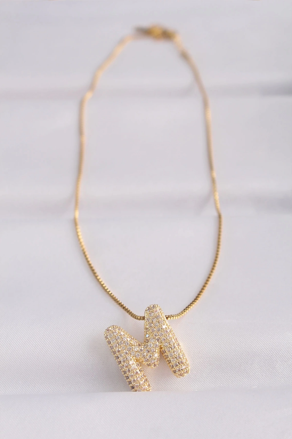 316L Çelik Zincirli Zirkon Taşlı M Harfli Gold Renk Bubble Kolye