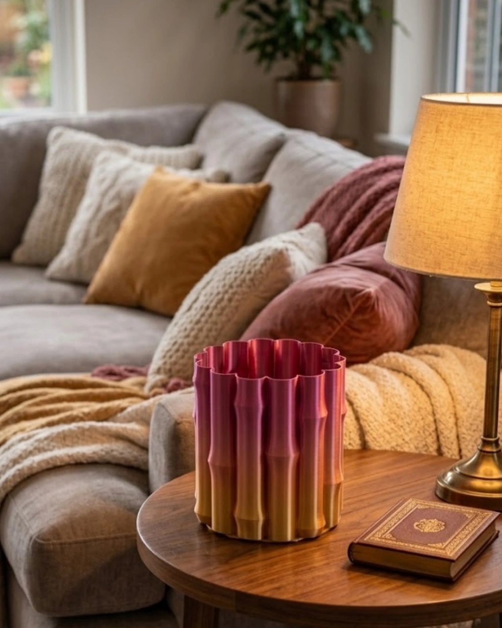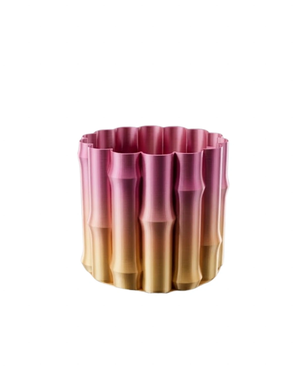 Şık ve modern bir yaşam alanı oluşturmak isteyenler için tasarlanan mor sarı degrade 3D vazo, dekorasyonunuza farklı bir boyut kazandırır. Özgün kıvrımlı yapısı ve dikkat çekici renk geçişi sayesinde bulunduğu ortamda odak noktası haline gelir.Estetik tasarımının yanı sıra fonksiyonel kullanımı ile de öne çıkar. İster çiçeklerle ister tek başına dekoratif obje olarak kullanılabilir. Modern, bohem ve çağdaş dekorasyon tarzlarına uyum sağlayarak yaşam alanlarınıza uyumlu bir bütünlük sunar.Kaliteli ve dayanıklı yapısı sayesinde uzun süreli kullanım sağlar. Ev, ofis, kafe veya stüdyo gibi farklı alanlarda tercih edilebilir. Aynı zamanda sevdiklerinize şık ve farklı bir hediye alternatifi olarak da değerlendirilebilir.