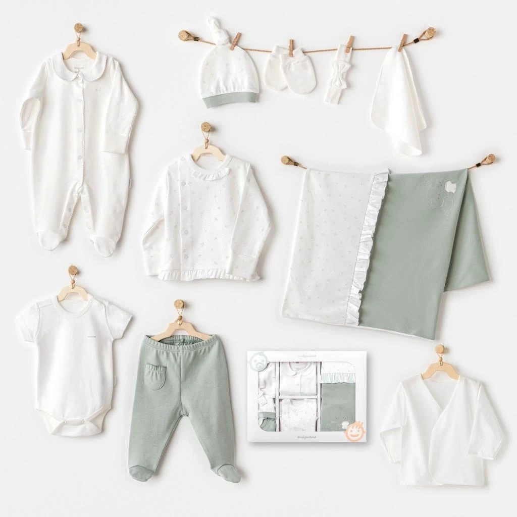 Ürünlerimiz bebeğinizin sağlığı düşünülerek birinci sınıf ham maddelerden üretilmiştir. Bebeğiniz için zararlı kimyasallar içermez. Azo-Free boya ve Nikel- Free aksesuarları ile uluslararası üretim teknikleri ve güvenlik standartlarına sahiptir. Benzer renklerle birlikte yıkayınız. Yüksek kalite standartları Oeko-Tex belgesi ile tescillenmiştir. Kumaş Özellikleri: %100 Pamuk. Ürün İçeriği: 1 adet tulum. 1 adet iç zıbın. 1 adet dış zıbın. 1 adet body. 1 adet pantolon. 1 adet battaniye (87x84 cm) 1 adet şapka. 1 adet eldiven. 1 adet fular. 1 adet ağız temizleme bezi. Yıkama Talimatları: 30°C sıcaklıkta yıkanız. Çamaşır suyu kullanmayınız. Düşük sıcaklıkta ütüleyniz. Tambur kurutma yapılmaz.Ürün görselinde birden fazla renk ve çeşit olduğunda ta bulunan ve gönderilecek olan ürün için soru sor kısmından bizimle iletişime geçebilirsiniz