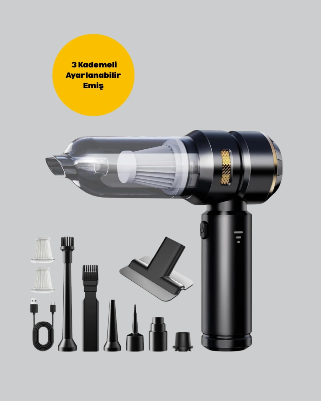 Şarjlı, kablosuz ve çok fonksiyonlu yapısıyla dikkat çeken bu araç içi süpürge, günlük temizlik rutinlerinizi daha kolay ve hızlı hale getiriyor. 2 in 1 fonksiyonuyla hem güçlü vakumlama hem de hava üfleme özelliklerini bir arada sunuyor. 15.000 PA emiş gücü, en küçük toz parçacıklarını bile etkili şekilde temizler. Üç farklı kademeli emiş seçeneği sayesinde kullanım alanınıza uygun performans elde edebilirsiniz. HEPA filtre sistemiyle toz ve partikülleri yüksek verimlilikle yakalarken yıkanabilir özelliğiyle uzun süreli ve hijyenik kullanım sunar. Geniş toz haznesi kolayca boşaltılabilir ve temizlenebilir. Kompakt ve hafif tasarımıyla hem taşınabilir hem de ergonomiktir. Uzun süreli kullanımlarda bile rahatlık sağlayan tutma kolu, temizlik işlerinizi keyifli hale getirir. Sessiz motor teknolojisi sayesinde gürültüsüz çalışır ve her ortamda kullanılabilir. Zengin aksesuar seti içerisinde dar ağızlı başlık, fırçalı başlık ve üfleme aparatı gibi seçenekler bulunur. Bu sayede aracınızın koltuk araları, döşemeleri, evinizdeki küçük alanlar, mobilya köşeleri ve daha pek çok alanı pratik bir şekilde temizleyebilirsiniz. Çok yönlü kullanımıyla hayatınızı kolaylaştıran bu süpürge, temizlik deneyiminizi profesyonel seviyeye taşır.