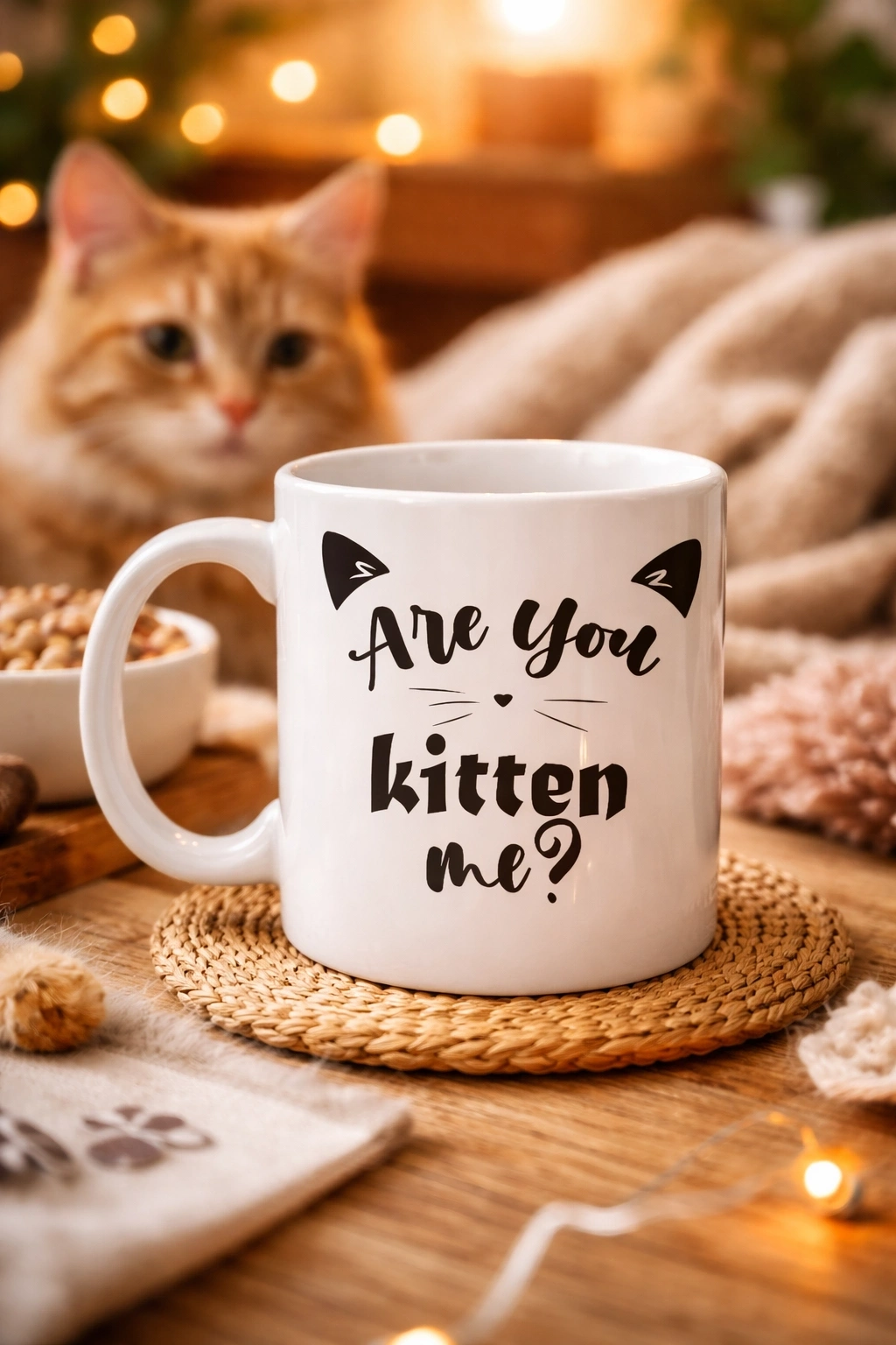 Üzerindeki “Are You Kitten Me?” yazısı, İngilizcede eğlenceli bir kelime oyunu olup “Benimle dalga mı geçiyorsun?” anlamına gelir. “Kitten” (yavru kedi) kelimesiyle yapılan bu tatlı espri, ürüne hem mizah hem de sevimlilik katıyor.