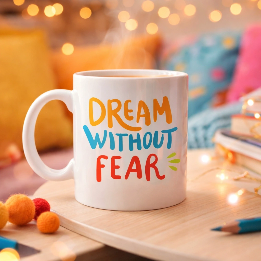 Üzerinde yer alan “Dream Without Fear” (Korkusuzca Hayal Et) yazısı, her yudumda sana cesaret ve motivasyon vermek için burada.