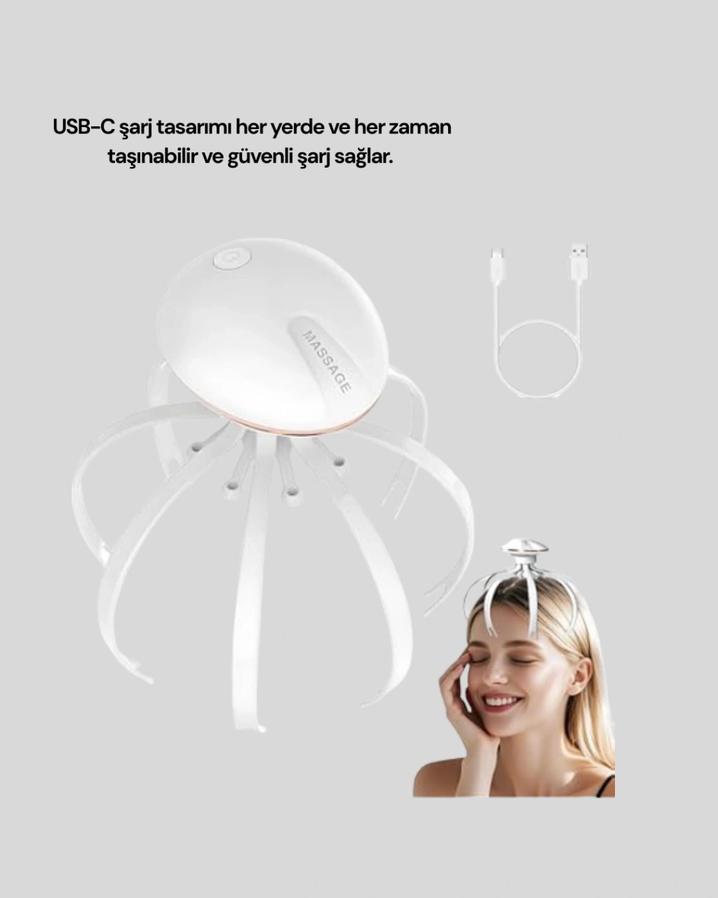 Bu elektrikli kafa masaj cihazı, günlük stres ve yorgunluğu azaltmak için özel olarak tasarlanmıştır. Eller serbest kullanım sağlayan ergonomik yapısı, rahat bir tutuş sunarken esnek ABS masaj başlıkları kafa derisinin doğal kıvrımlarına uyum sağlar. Böylece her kullanımda derinlemesine ve dengeli bir masaj deneyimi yaşanır.Tek tuşla kontrol edilen cihazda 3 farklı masaj modu bulunur. Yavaş, orta ve hızlı seçenekler sayesinde ihtiyacınıza göre masaj şiddetini kolayca ayarlayabilirsiniz. Sessiz motor yapısı, evde, ofiste veya dinlenme anlarında konforlu kullanım sağlar.
