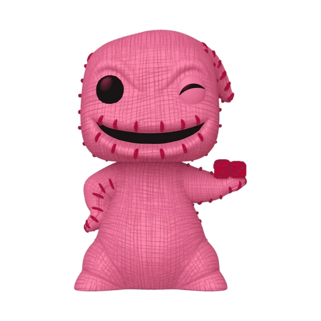 Oogie Boogie pembe bir kıyafet giydi, Elinde kırmızı bir zar seti ile tasarlandı.