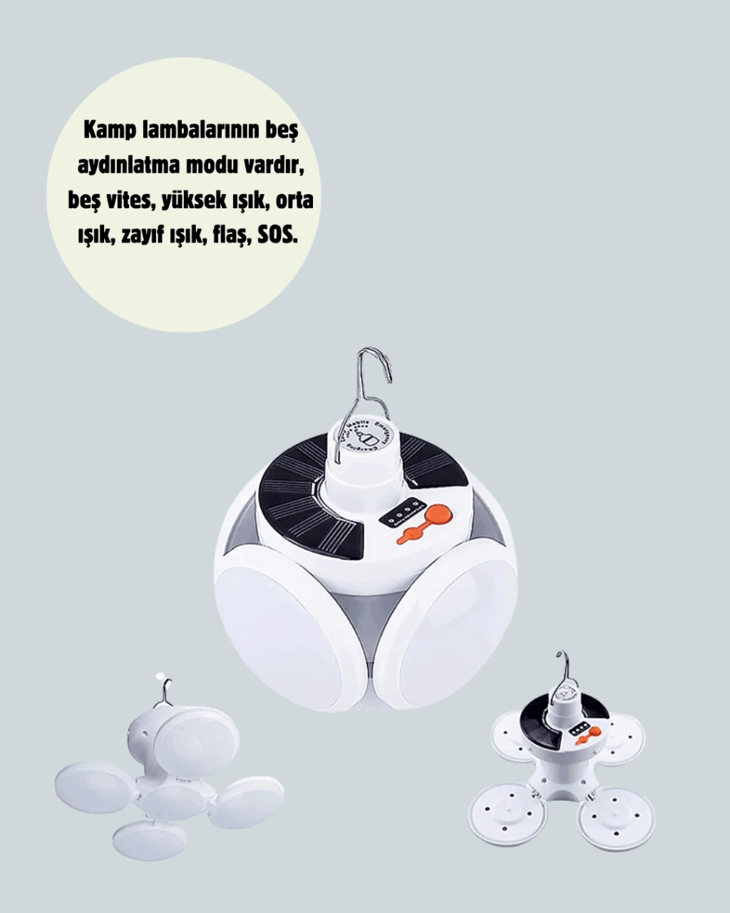 Bu şarjlı LED kamp lambası, hem güneş paneliyle hem de USB kabloyla şarj edilebilme özelliğiyle dikkat çeker. 5 kademeli ışık modu sayesinde ister loş bir ortam isterseniz acil durum aydınlatması için ideal ışık seviyesini seçebilirsiniz. Katlanabilir yapısı sayesinde istenilen yönlere ışık verebilir.Lambanın üst kısmında yer alan kanca ile çadırlara veya dış mekân yapılarına kolayca asılabilir. Yüksek kaliteli PVC gövde ve dayanıklı malzeme kullanımı sayesinde uzun ömürlüdür. Kompakt tasarımı sayesinde taşınabilirliği kolaydır ve seyahat çantanıza rahatlıkla sığar. Hem kamp hem ev kullanımı için uygundur.