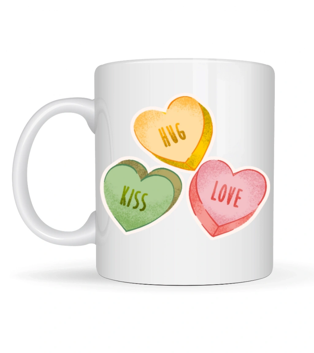 Hug, Kiss ve Love yazılı kalp figürleriyle süslenen Model 10 porselen kupa, pozitif enerjisiyle gününüze renk katar. Canlı renkleri ve tatlı tasarımı sayesinde hem kendiniz hem de sevdikleriniz için harika bir hediye seçeneğidir.