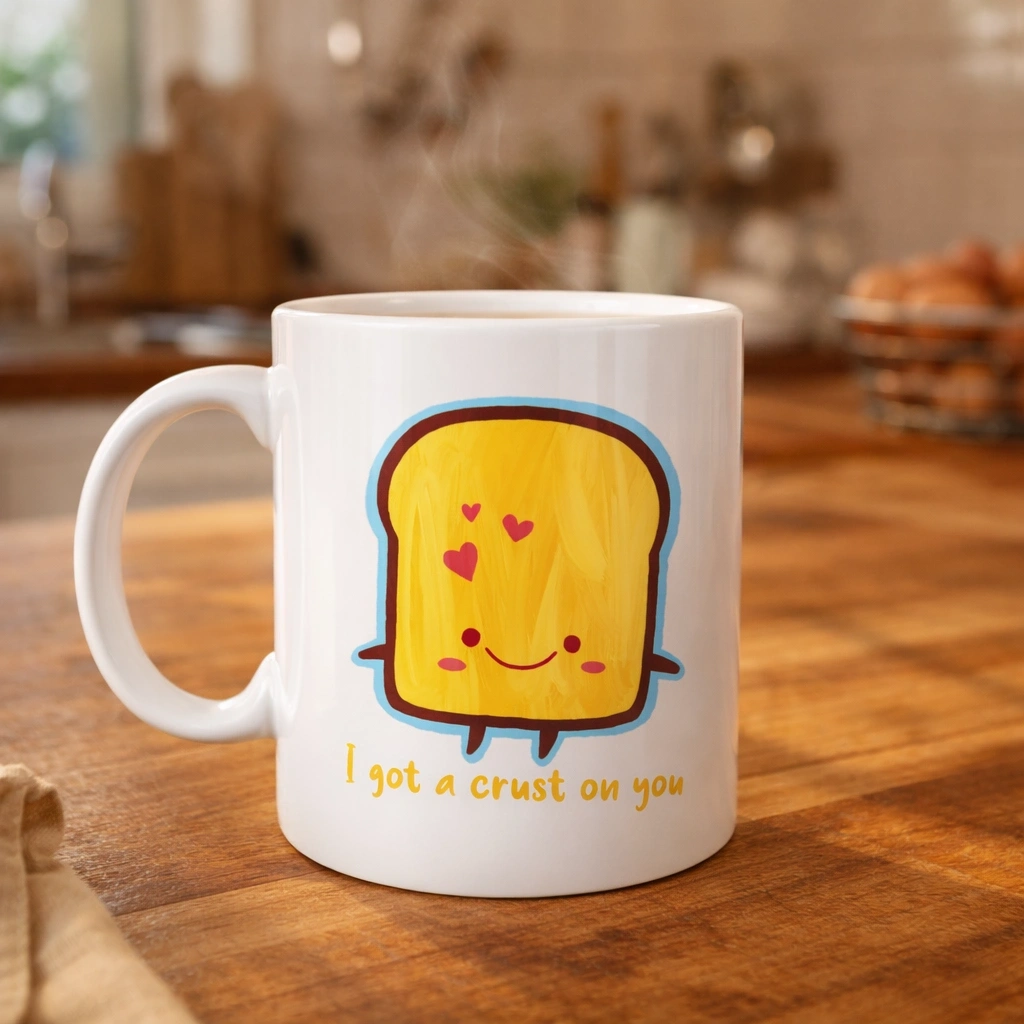 Model 23 porselen kupa, üzerindeki tatlı ekmek illüstrasyonu ve esprili yazısıyla kahve keyfine neşe katıyor.