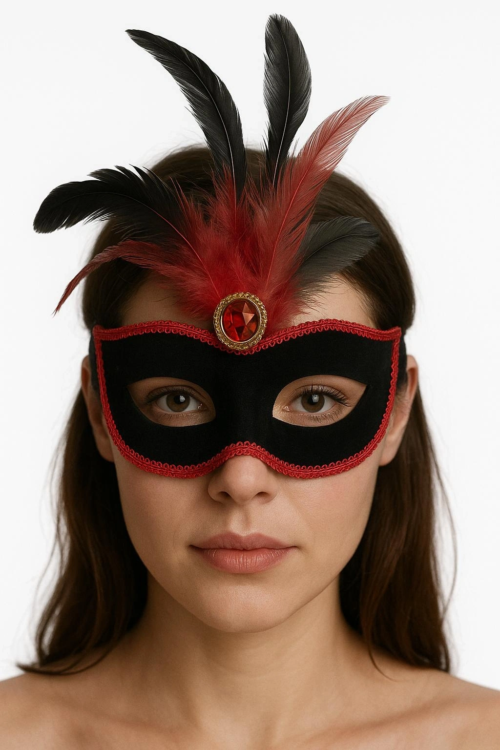 - Kırmızı dantel, siyah ve kırmızı tüyler ve siyah süet kaplama ile süslenmiş göz alıcı bir parti maskesi tasarımı.