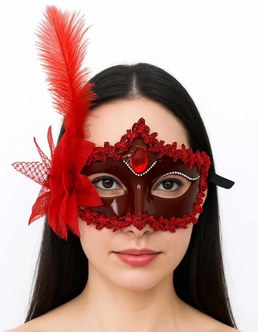 Kırmızı Renk Yandan Tüylü Güllü Parti Balo Venedik Maskesi 16x22, gizemli ve zarif bir görünüm oluşturmak isteyenler için tasarlanmış özel bir üründür. Kırmızı rengin asaleti ve yan tarafındaki tüy ve gül detayları ile göz alıcı bir stil sunarken, Venedik maskelerinin gizemli ruhunu da yansıtır.