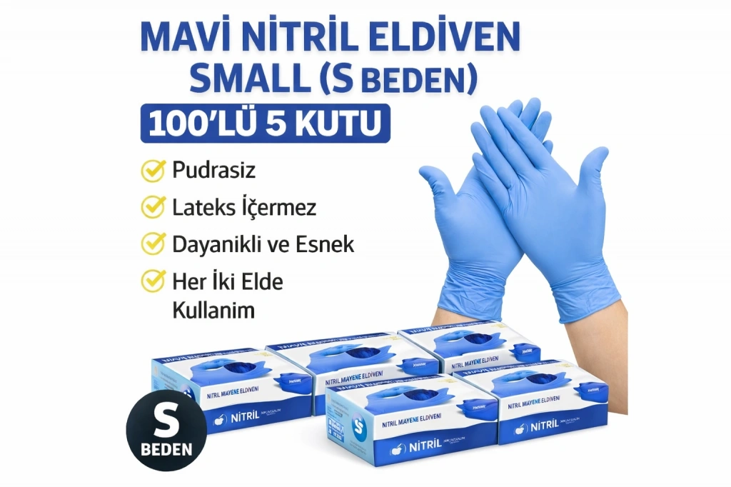 Mavi Nitril Eldiven Small S Beden Pudrasız 100’lü 5 Kutu Tek Kullanımlık Muayene Eldiveni Lateksiz Koruyucu Eldiven Seti Mavi nitril eldiven Small (S) beden, küçük el yapısına sahip kullanıcılar için özel olarak tasarlanmış olup ele tam uyum sağlayarak maksimum konfor ve hassasiyet sunar. Dayanıklı nitril malzemeden üretilmiş olup yırtılmaya ve delinmeye karşı dirençlidir. Pudrasız ve lateks içermeyen yapısı sayesinde alerji riskini azaltır ve cilt dostu kullanım sağlar. Tek kullanımlık yapısı hijyen gerektiren tüm işlemler için güvenli ve pratik kullanım sunar. Esnek ve ergonomik tasarımı el hareketlerini kısıtlamaz, uzun süreli kullanımlarda bile konfor sağlar. Kaymaz yüzeyi sayesinde hassas işlemlerde güçlü kavrama avantajı sunar. Ürün, 100 adet eldiven içeren 5 kutudan oluşmaktadır. Toplam 500 adet nitril eldiven içerir. Sağlık, temizlik, gıda, güzellik ve endüstriyel kullanım için uygundur.