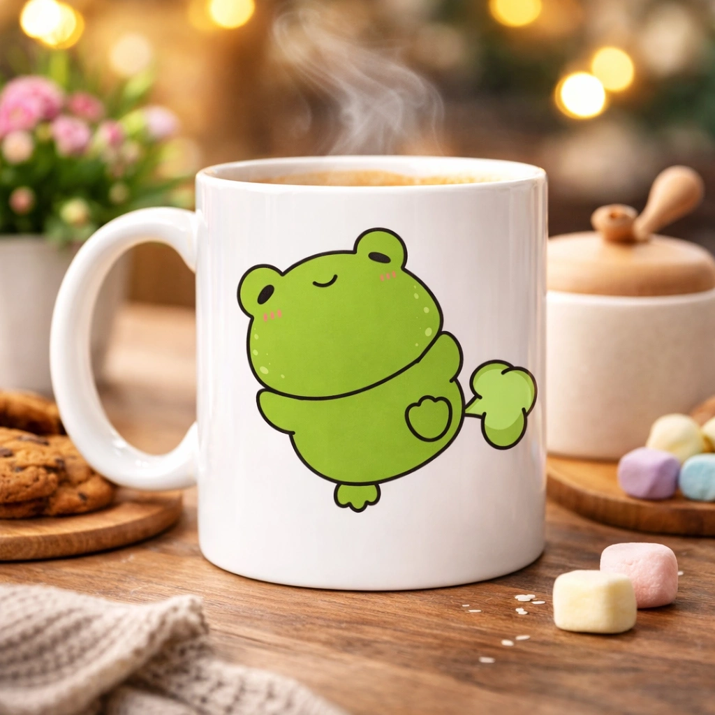 Bu sevimli kurbağa figürlü porselen kupa, rahatlamış duruşu ve tatlı ifadesiyle günün stresini unutturuyor.
