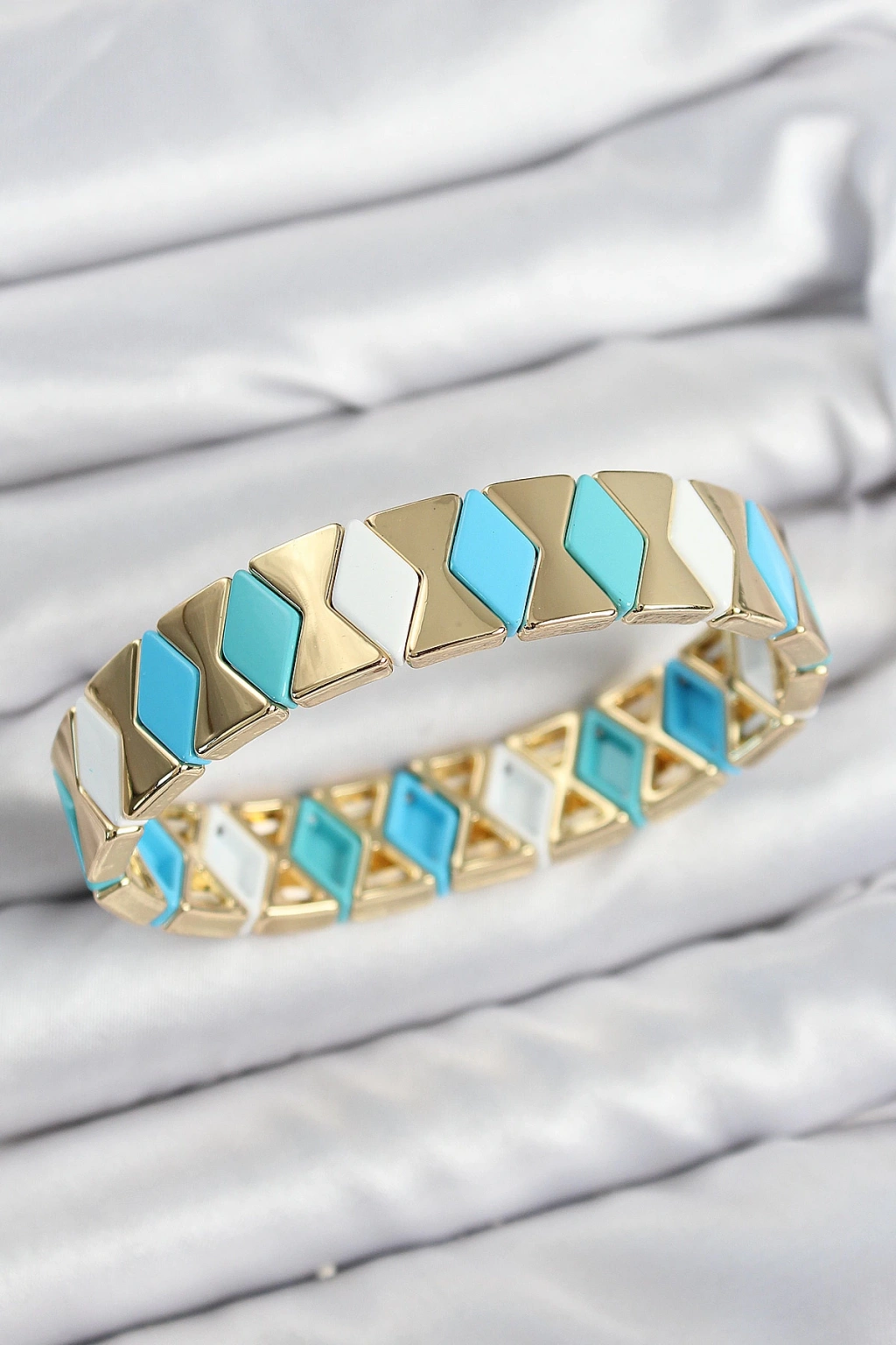 Pirinç Baklava Desenli Mavi Beyaz Gold Renk Lastikli Kadın Bileklik