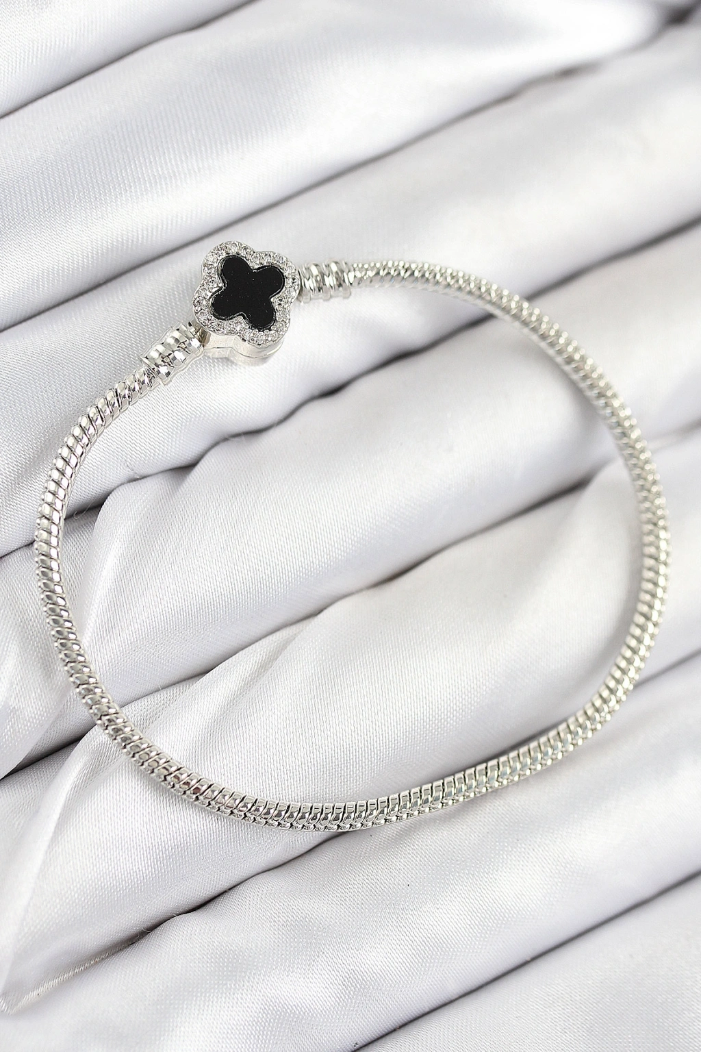 Pirinç Charm Zirkon Taşlı Yonca Model Gümüş Renk Kadın Bileklik