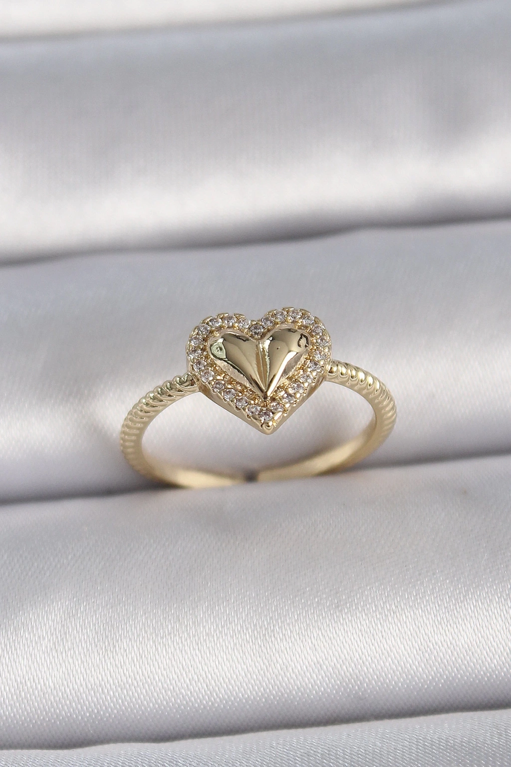Pirinç Gold Renk Ayarlanabilir Zirkon Taşlı Kalp Model Kadın Yüzük