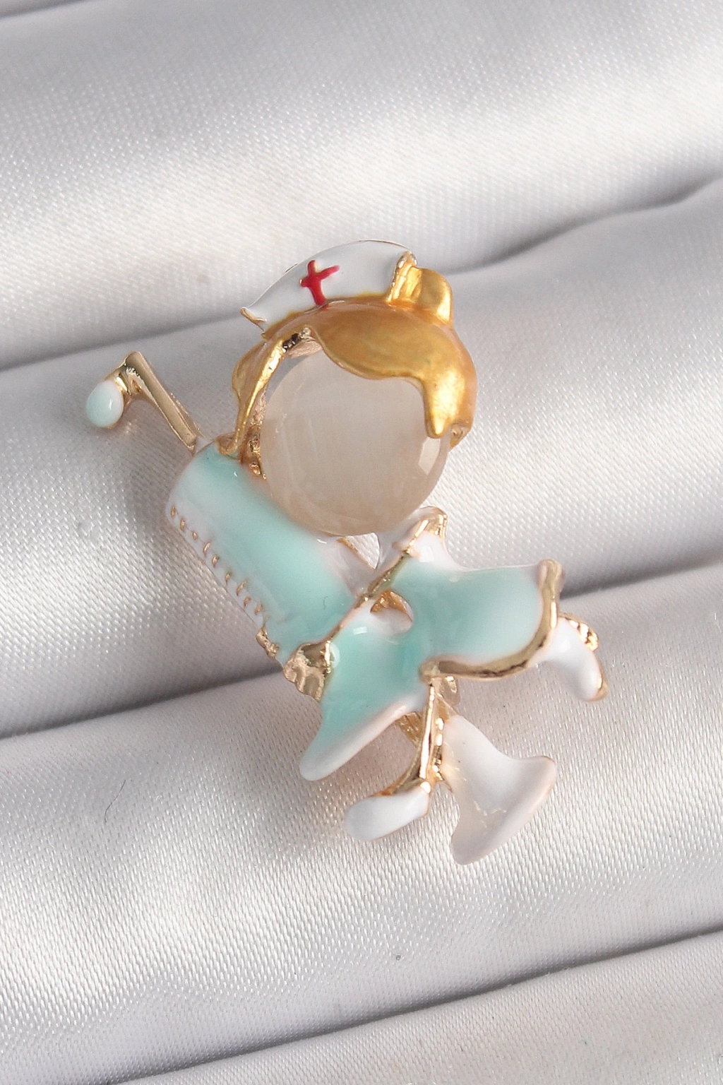 Pirinç Gold Renk Beyaz Mavi Renk Hemşire Model Şırınga Detay Kadın Broş