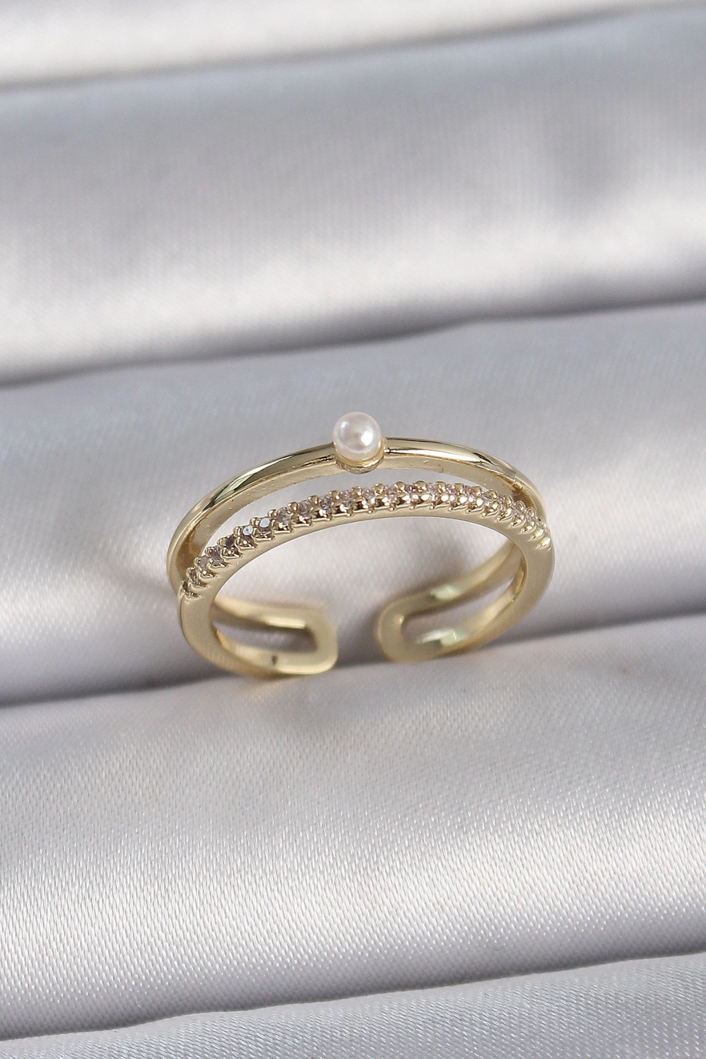 Pirinç Gold Renk Zirkon Taşlı İnci Detay Ayarlanabilir Model Kadın Yüzük