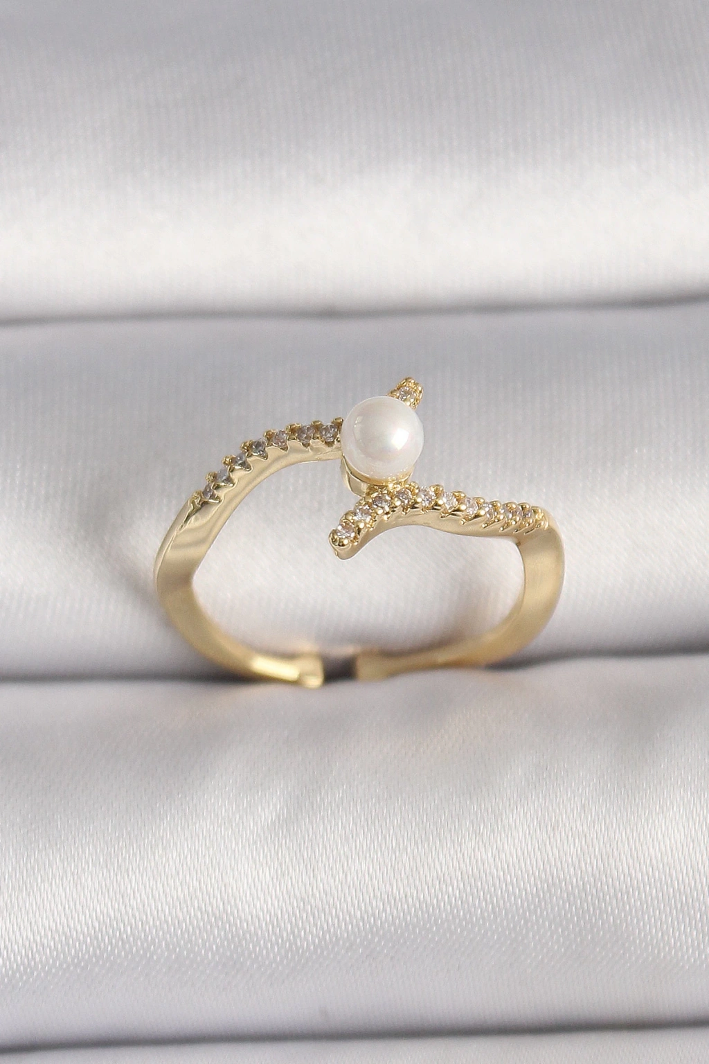 Pirinç Gold Renk Zirkon Taşlı İncili Ayarlanabilir Yüzük