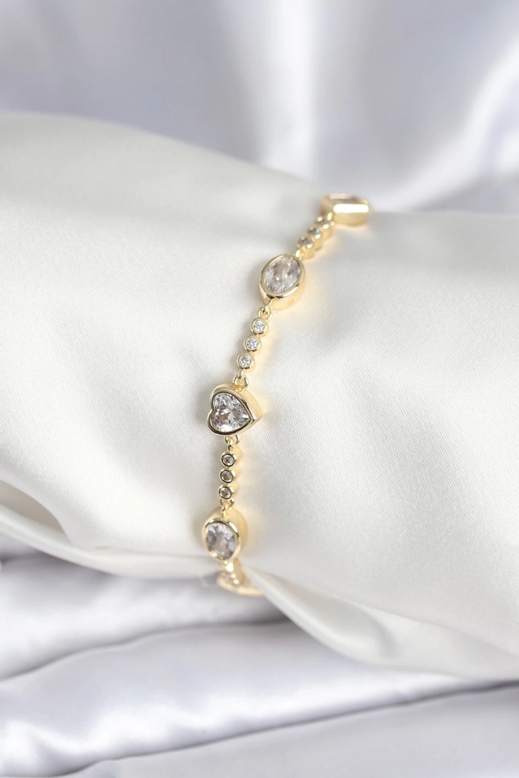 Pirinç Gold Renk Zirkon Taşlı Kalpli Model Kadın Bileklik
