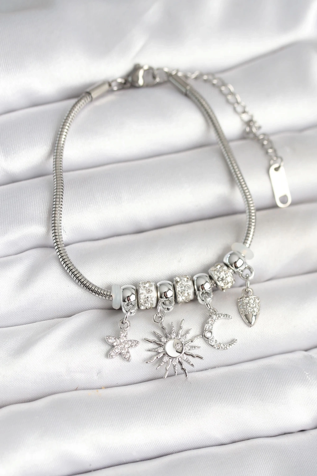 Pirinç Gümüş Renk Ay ve Güneş Charmlı Kadın Bileklik
