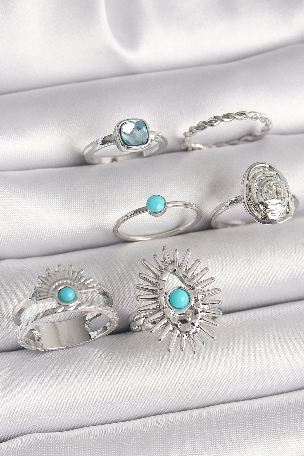 Pirinç Gümüş Renk Mavi Taşlı Kare Zirkon Taş Detaylı Kadın Yüzük Kombini