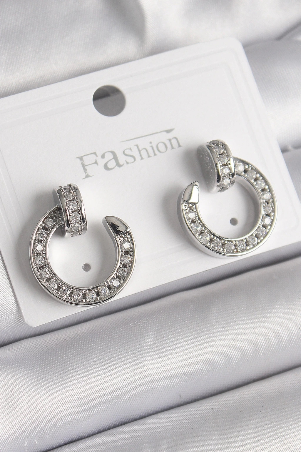 Pirinç Gümüş Renk Zirkon Taşlı Çivi Halka Model Kadın Küpe