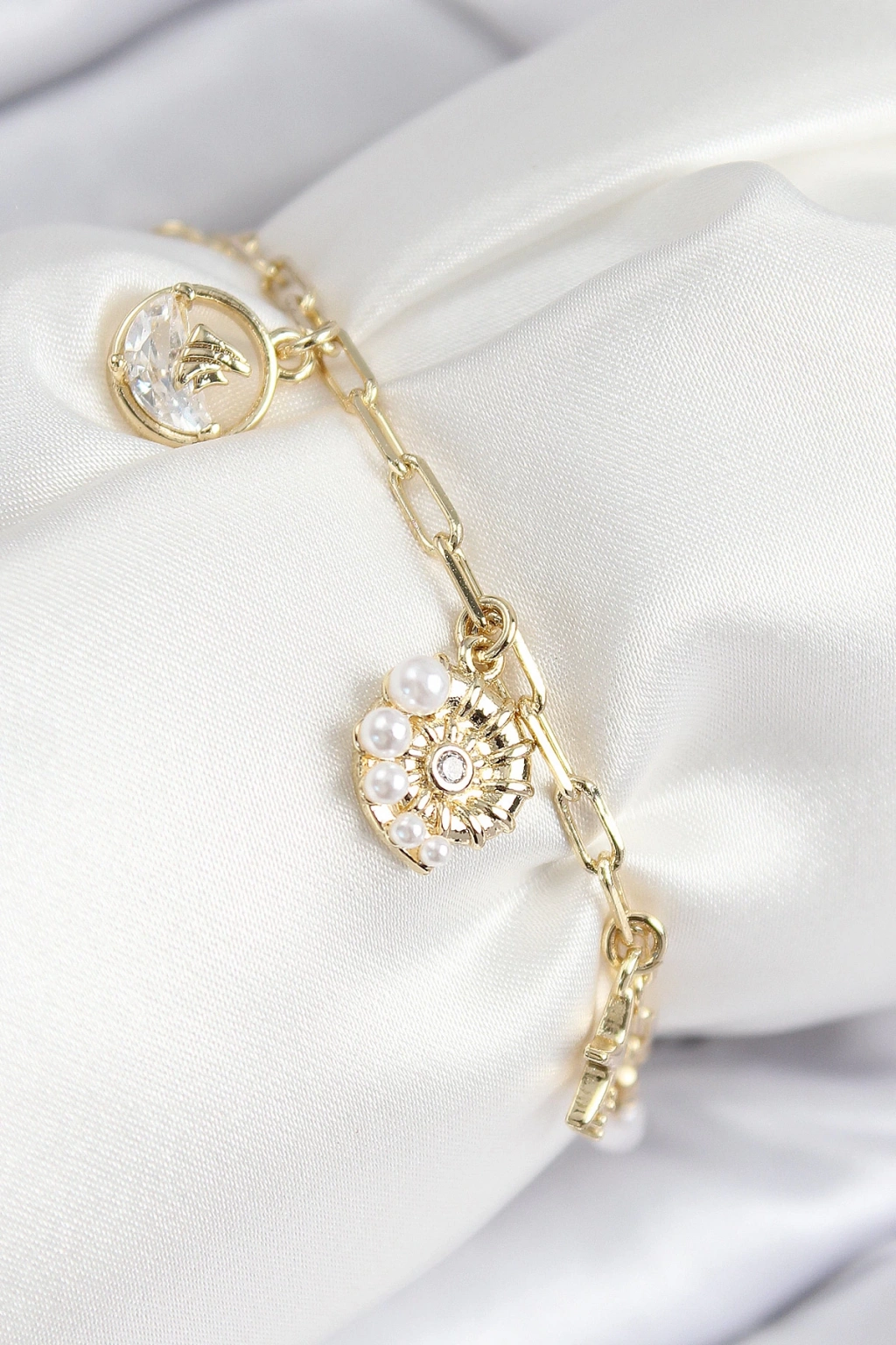Pirinç Zirkon Taşlı Deniz Kabuğu Model Gold Renk Kadın Bileklik