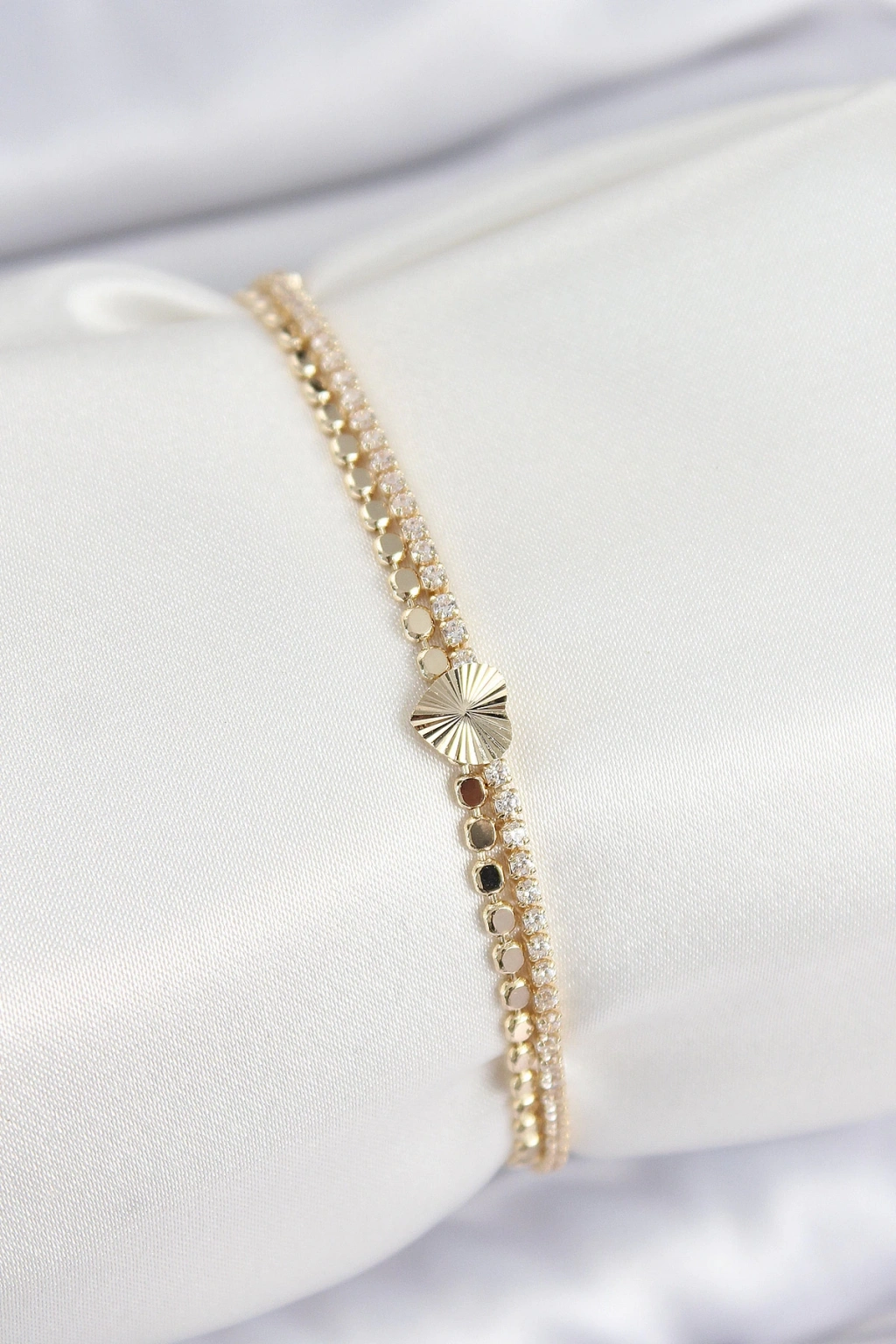 Pirinç Zirkon Taşlı Ezme Zincirli Kalp Model Gold Renk Kadın Bilekilk