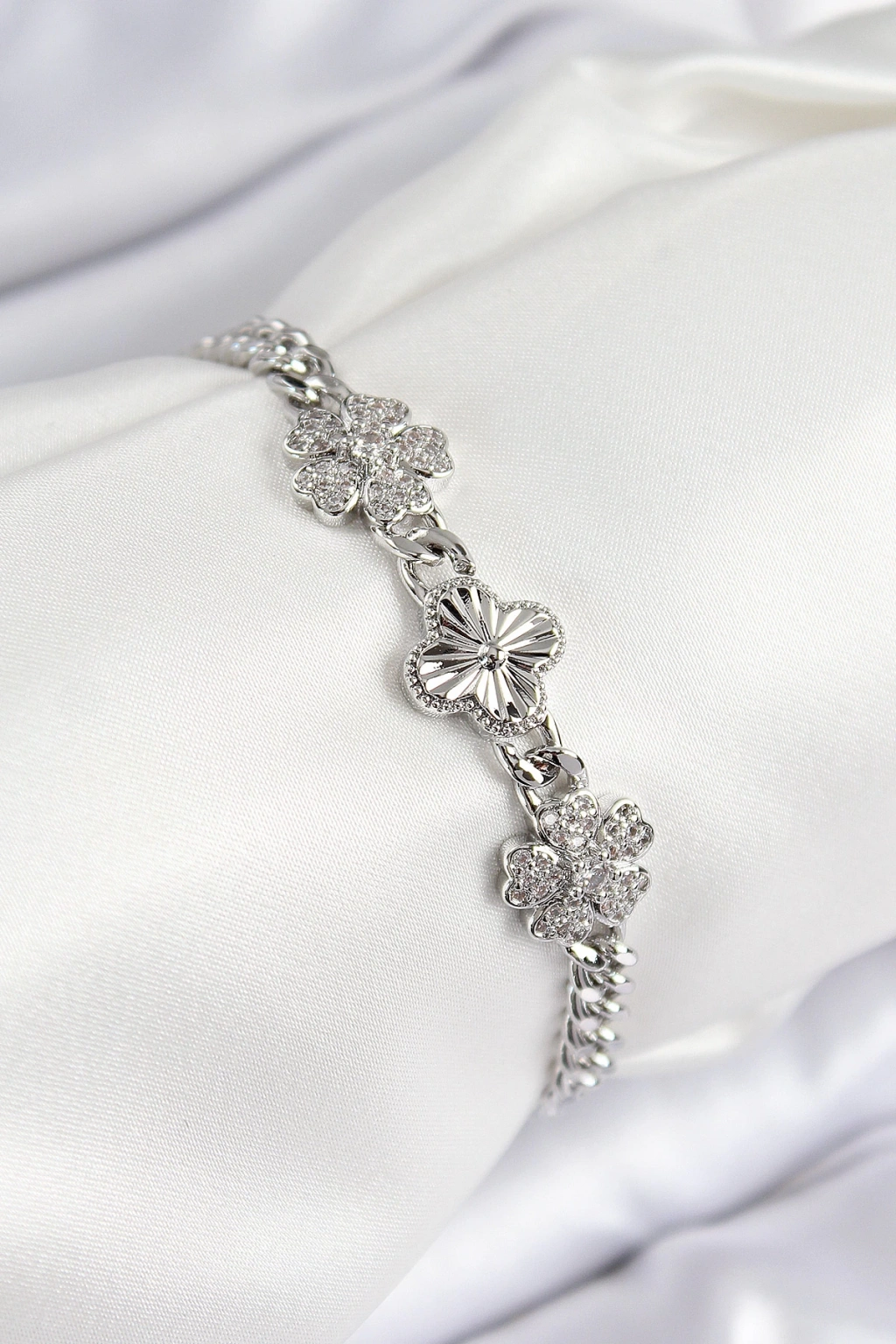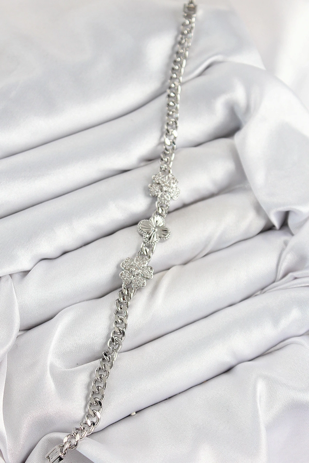 Pirinç Zirkon Taşlı Yonca Model Gümüş Renk Kadın Bileklik