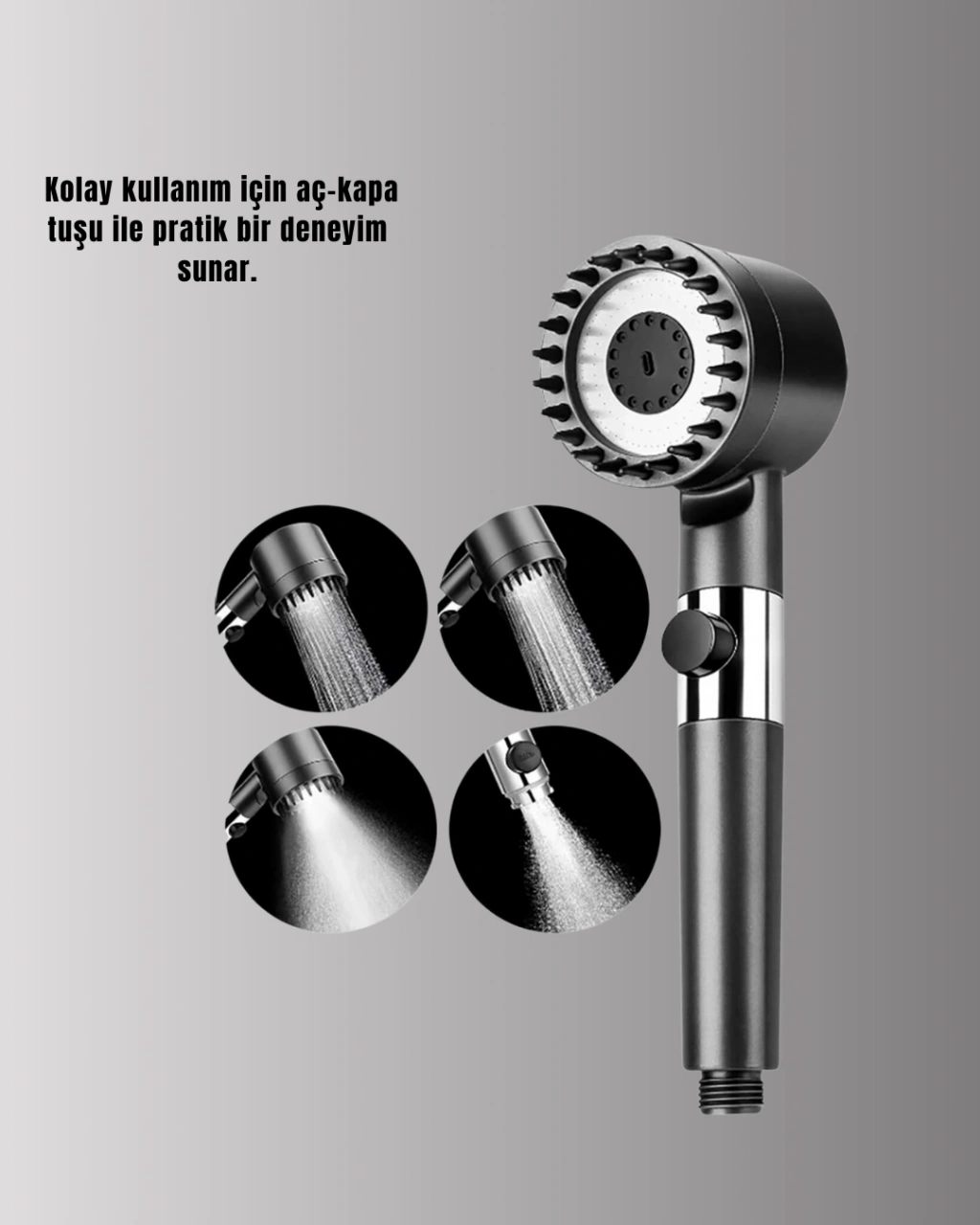 Yeni nesil filtreli duş başlığı, fonksiyonel özellikleri ve estetik tasarımı ile dikkat çeker. Aç kapa tuşu sayesinde pratik kullanım sunar ve su tasarrufuna yardımcı olur.Masaj etkisi yaratan su çıkış sistemi, duş sırasında rahatlatıcı bir deneyim sağlar. Filtreli yapısı, suyun daha temiz hissedilmesine katkıda bulunur.Dayanıklı plastik malzemesi, kolay temizlenebilir yüzeyi ve şık tasarımı ile günlük banyo kullanımında ideal bir çözümdür.