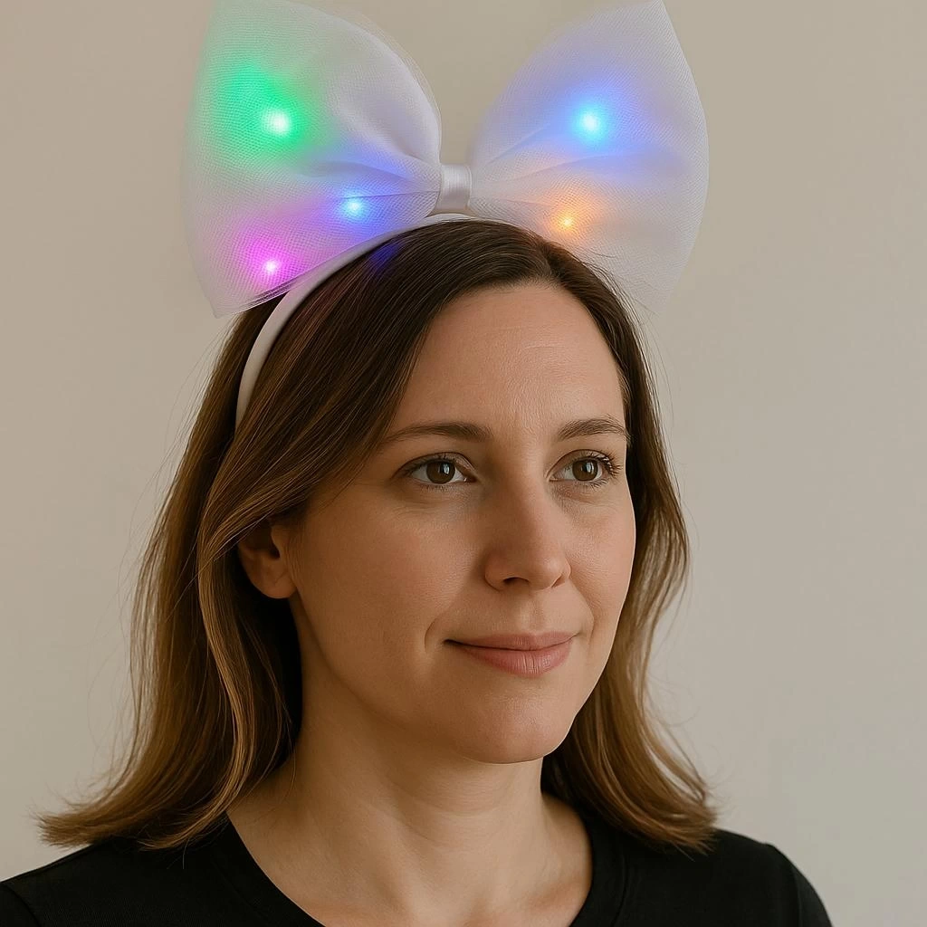 Bu güzel tül parti tacı, her partiye veya özel vesileye renk katmak için mükemmeldir. Tacın beyaz fiyonk şekli ve rengarenk LED ışıkları onu göz alıcı bir aksesuar haline getirir. 25x25 cm boyutlarındadır ve çoğu yetişkin ve çocuğa uygundur.