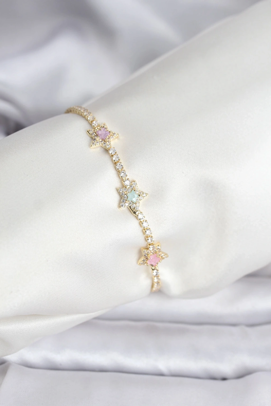 Renkli Yıldız Model Zirkon Taşlı Gold Renk Pirinç Su Yolu Kadın Bileklik