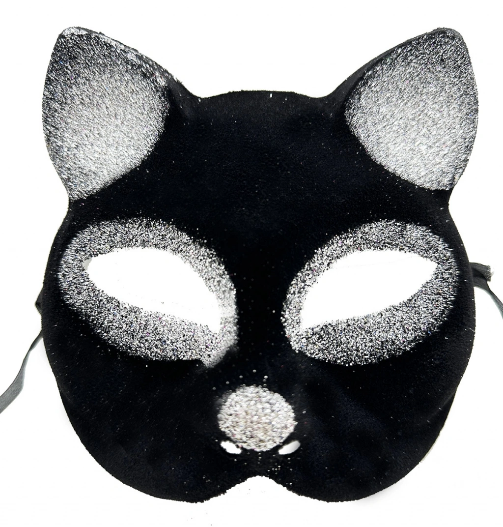 - Siyah süet ve gümüş simlerle süslenmiş sevimli bir kedi maskesi tasarımı.