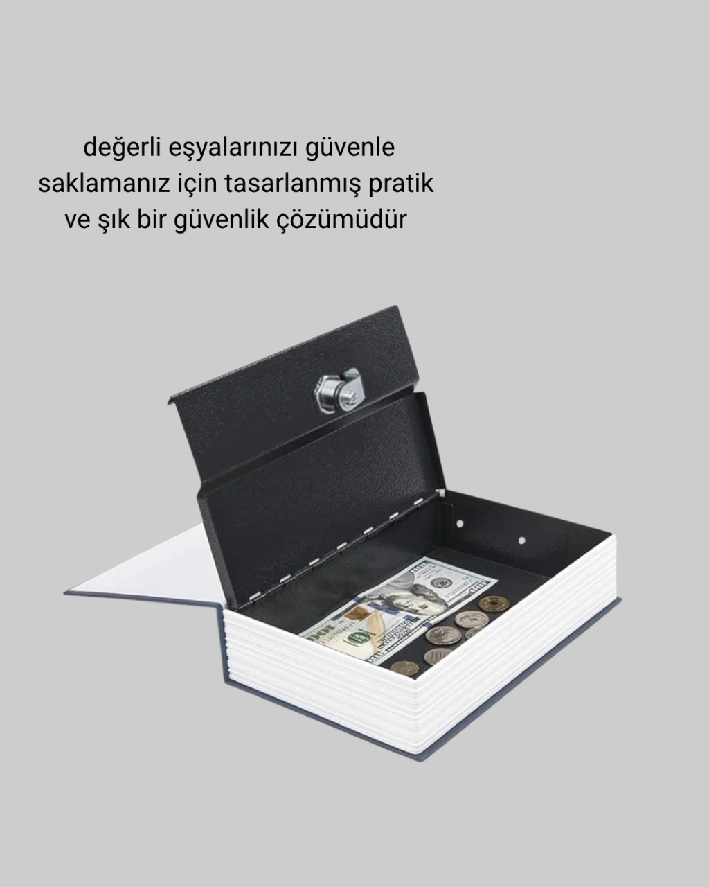 Evinizde veya ofisinizde dikkat çekmeden değerli eşyalarınızı saklayabileceğiniz bu gizli kitap kasa, güvenlik ve estetiği bir araya getiriyor. Gerçek bir kitap görünümüne sahip dış tasarımıyla, bulunduğu ortama mükemmel şekilde kamufle olur.Kapağında İngilizce sözlük baskısı bulunur, bu da onu diğer kitaplardan ayırt etmeyi neredeyse imkansız hale getirir.İç kısmında yüksek dayanımlı metal kasa yer alır. Anahtarlı kilit sistemi, ekstra güvenlik sağlar ve ürünle birlikte 2 adet anahtar gönderilir.Küçük ama etkili depolama alanı, takı, para, evrak, kart veya özel hatıralarınızı güvenle muhafaza etmenize yardımcı olur.18,5 x 11,5 x 5,6 cm boyutlarıyla kitaplık raflarına mükemmel şekilde sığar ve dekor düzenini bozmaz.Kolay taşınabilir olması sayesinde hem evde hem iş yerinde ya da seyahatlerde rahatlıkla kullanılabilir.Şık dış tasarımı, sağlam iç yapısı ve işlevsel kullanımıyla bu gizli kitap kasa, modern güvenlik çözümleri arasında öne çıkıyor.Hem işlevsel bir ürün arayanlar hem de sevdiklerine yaratıcı bir hediye vermek isteyenler için mükemmel bir tercihtir.