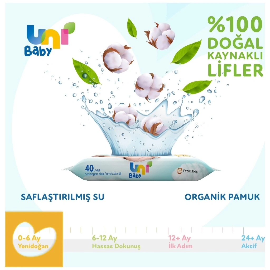 %99 saf su ve pamuk%1 nazik içeriklerle formüle edilmiş Uni Baby Islak Pamuk Mendil, yenidoğan cildinin ihtiyacı olan bakımı sunar.