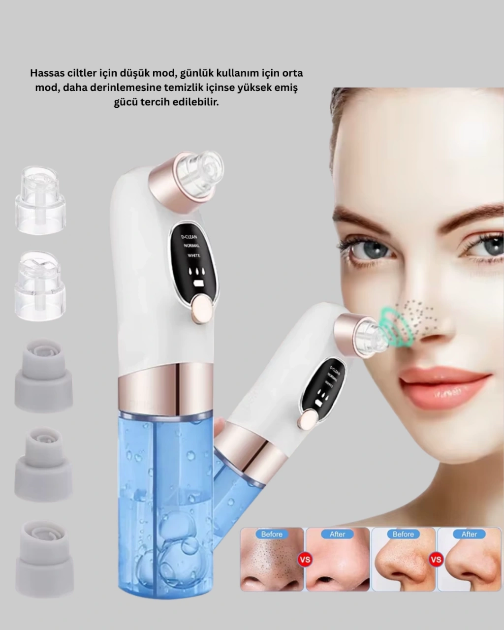 Cildinize pürüzsüzlük ve tazelik kazandırmak artık çok kolay! Bu vakum teknolojili siyah nokta temizleyici, güçlü emiş sistemiyle gözeneklerdeki kir, yağ ve siyah noktaları nazikçe temizler.3 farklı kademe ayarıyla her cilt tipine özel temizlik sağlar — hassas, normal ve derin bakım modlarıyla maksimum etki sunar.Cilt dostu tasarımı sayesinde yüzünüzde tahriş yaratmadan etkili temizlik yapar.Titreşim masaj özelliği, kan dolaşımını hızlandırarak cilt hücrelerini canlandırır. Düzenli kullanımda gözenekler sıkılaşır, cilt tonu eşitlenir ve daha aydınlık bir görünüm ortaya çıkar.Kullanımı son derece pratik olan bu cihaz, su haznesiyle birlikte çalışarak temizlik sırasında cildin nem dengesini korur. Kompakt ve taşınabilir boyutuyla hem evde hem seyahatte kolayca kullanılabilir.Dayanıklı yapısı ve uzun ömürlü performansı sayesinde güvenle tercih edilebilir.Siyah noktalardan kurtulmak, cildinize parlaklık kazandırmak ve profesyonel bir bakım etkisi yaratmak istiyorsanız bu cihaz tam size göre!