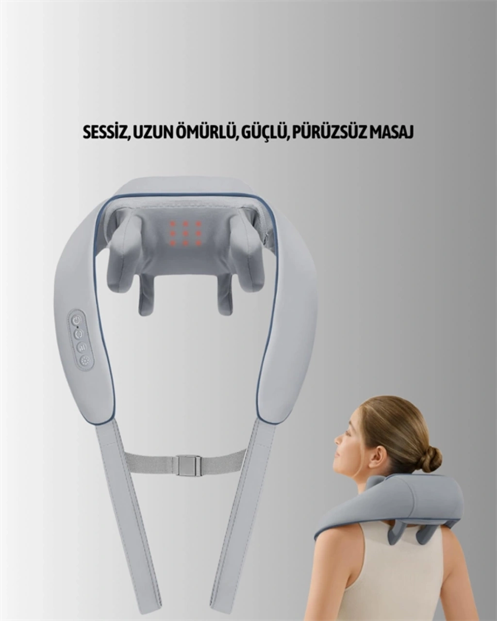 VNB-01, günün yorgunluğunu geride bırakmak isteyen kullanıcılar için özel olarak geliştirilmiş, çok yönlü bir boyun masaj cihazıdır. Sadece boyun bölgesiyle sınırlı kalmadan omuz, sırt, bel ve bacak bölgelerinde de etkili sonuçlar sunar. Gelişmiş teknolojisiyle manuel masajın etkilerini taklit ederek kas düğümlerini çözmekte ve gergin kasları rahatlatmakta son derece başarılıdır.Yoğurma başlıkları, parmak ucu baskısını simüle ederek gerçek bir insan eli hissi verir. Biyonik masaj teknolojisi, kaslara hem yüzeysel hem de derin dokulu basınç uygulayarak etkin bir gevşeme sağlar.Cihazda yer alan iki farklı masaj modu, kullanıcıların günlük ihtiyaçlarına ve fiziksel durumlarına göre seçim yapmasına olanak tanır. Daha hafif mod rahatlatıcı bir deneyim sunarken, yoğun mod derin kas gerginliğini hedef alır. Üç kademeli hız ayarı ile bu modlar özelleştirilebilir.Masaj deneyimini destekleyen bir diğer önemli özellik ise ısı terapisi fonksiyonudur. Cihaz, kasların gevşemesini hızlandıran ısıyı kontrollü şekilde yayarak kan dolaşımını artırır, böylece daha etkili ve kalıcı bir rahatlama sunar.Fırçasız, sessiz motor teknolojisi, hem uzun ömürlü bir kullanım sağlar hem de cihazın sessiz çalışmasına imkan tanır. Özellikle sessiz ortamlarda rahatsızlık vermeden kullanılabilir.1800 mAh bataryası, cihazın şarjlı ve kablosuz olarak kullanılmasına olanak tanır. İster evde, ister iş yerinde, ister araçta kullanıma uygundur. Kutu içeriğinde araç adaptörü de yer almaktadır, böylece yolculuklarda bile kullanım kolaylığı sunar.Ergonomik olarak tasarlanmış U şekli, boyun bölgesini tamamen sarar ve cihazın doğru konumda sabit kalmasına yardımcı olur. Ayarlanabilir askıları, farklı vücut tiplerine uyum sağlar ve kullanım sırasında ellerinizi serbest bırakmanıza olanak tanır.Cihazın kontrolü, yan paneldeki tuşlar sayesinde oldukça basittir. Güç düğmesiyle cihazı açıp kapatabilir, modları değiştirebilir ve hız ayarlarını kolayca yapabilirsiniz.Ürün Teknik Özellikleri: Renk: Gri Batarya: 1800mAh Giriş Voltajı: 5V Güç Tüketimi: 10W Ağırlık: 1290 gram Malzeme: A Kalite ABS Isıtma Özelliği: Var Masaj Modları: 2 farklı mod Hız Seviyesi: 3 kademeli ayar Motor Tipi: Sessiz fırçasız motor Kullanım Alanı: Boyun, omuz, sırt, bel, bacak